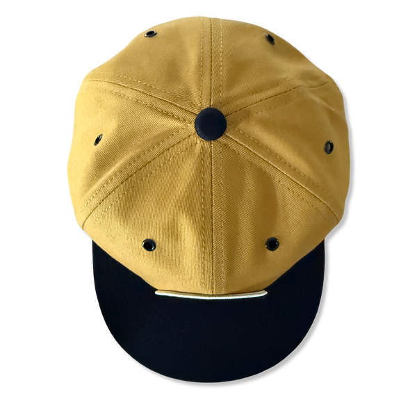 Mustard Gold crown with contrasting Black brim, Button and eyelets. Cream under brim.